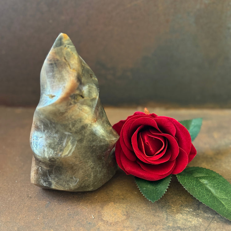 The Black Moonstone crystal is a deeply spiritual stone known for its connection to lunar energy and its role as a stone of new beginnings. It is revered for helping you connect with your inner self, heightening intuition, and guiding you through periods of spiritual transformation and renewal.