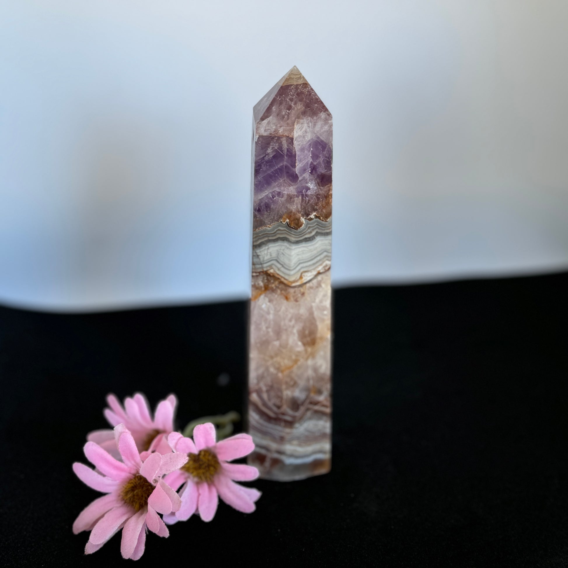 Experience the transformative power of the Amethyst and Agate Tower, a sacred crystal fusion uniting spiritual awakening, grounding, and emotional healing.