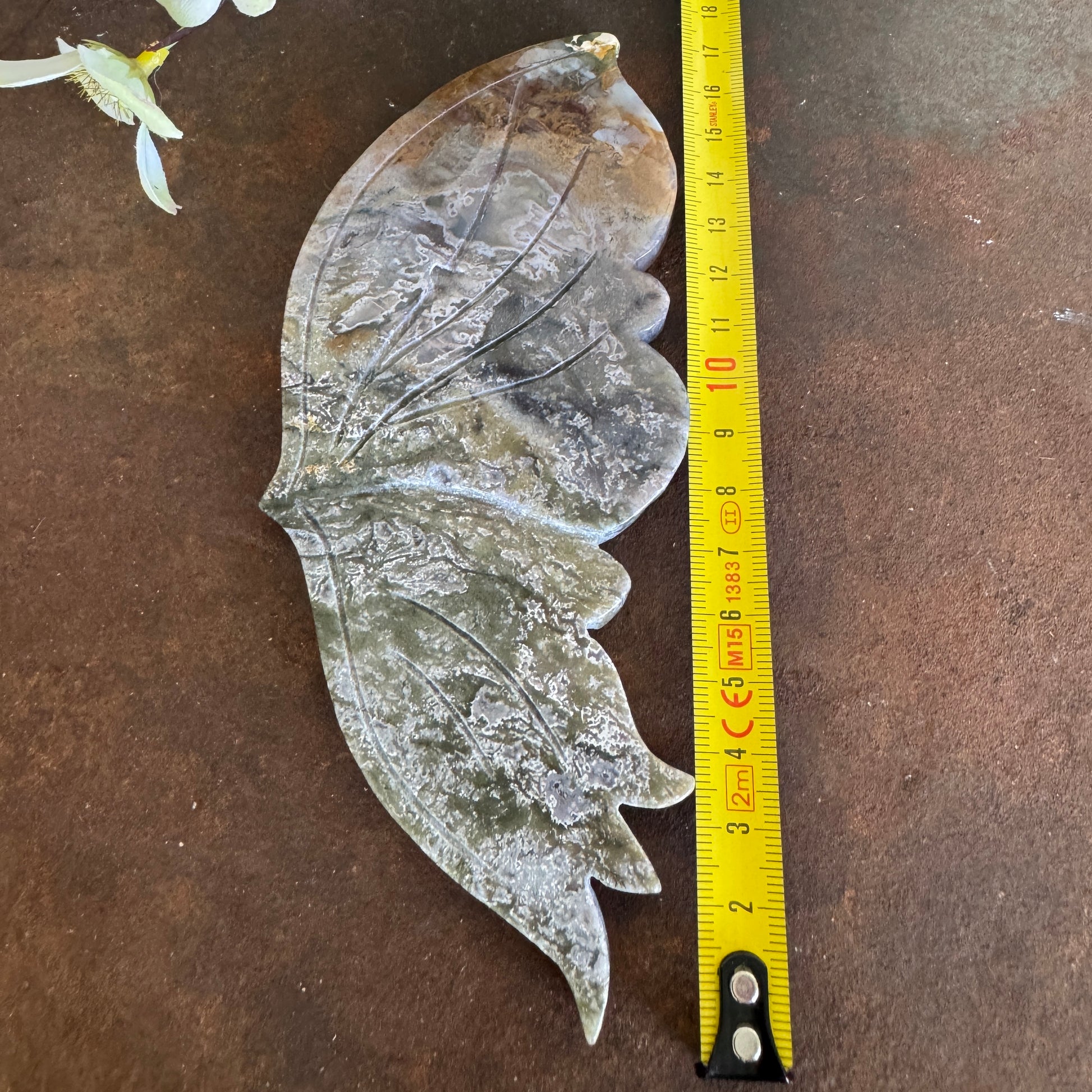 Features natural Moss Agate Crystal Wings in lush, earthy hues – each piece one of a kind