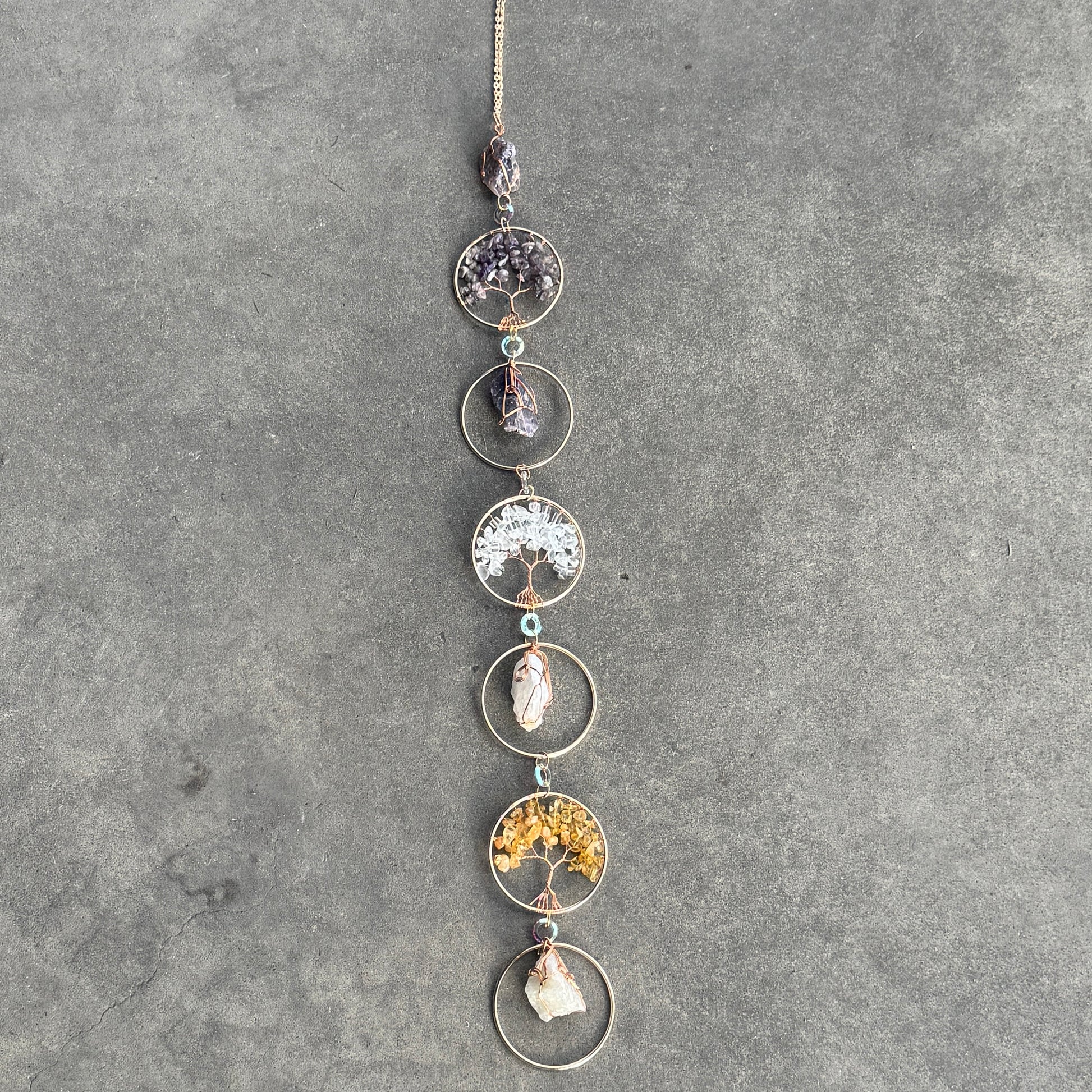 Each handcrafted wall hanging features six circular crystal frames (approximately 5cm in diameter) alternating between dazzling Tree of Life crystal chip designs and natural raw crystals, all secured with polished copper wire to amplify energy flow, enhance spiritual alignment, and promote deep energetic harmony.