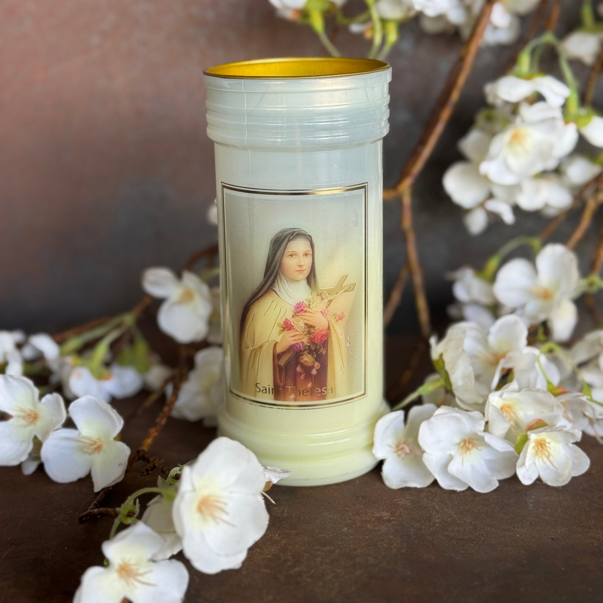 Symbol of St. Theresa’s Faith – St. Theresa believed in living her “Little Way” by doing small acts of love with great devotion. This prayer candle serves as a reminder of her humility, compassion, and unwavering faith.