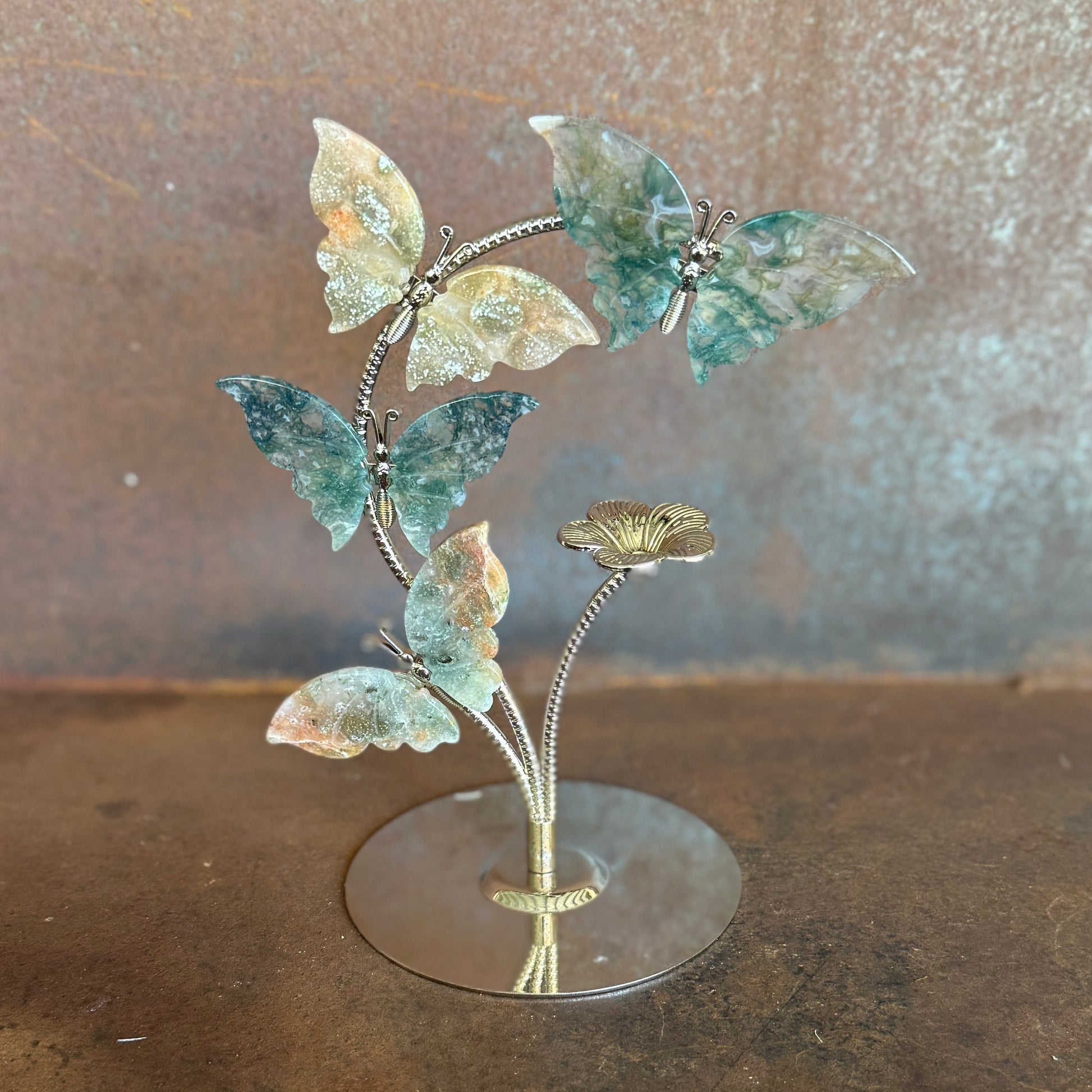 Each hand-carved butterfly is sculpted from genuine Moss Agate, a stone of abundance, emotional healing, and connection to nature. Mounted beautifully on a sturdy stand, this crystal ornament captures both elegance and high-vibrational energy, making it a truly meaningful addition to any sacred space.