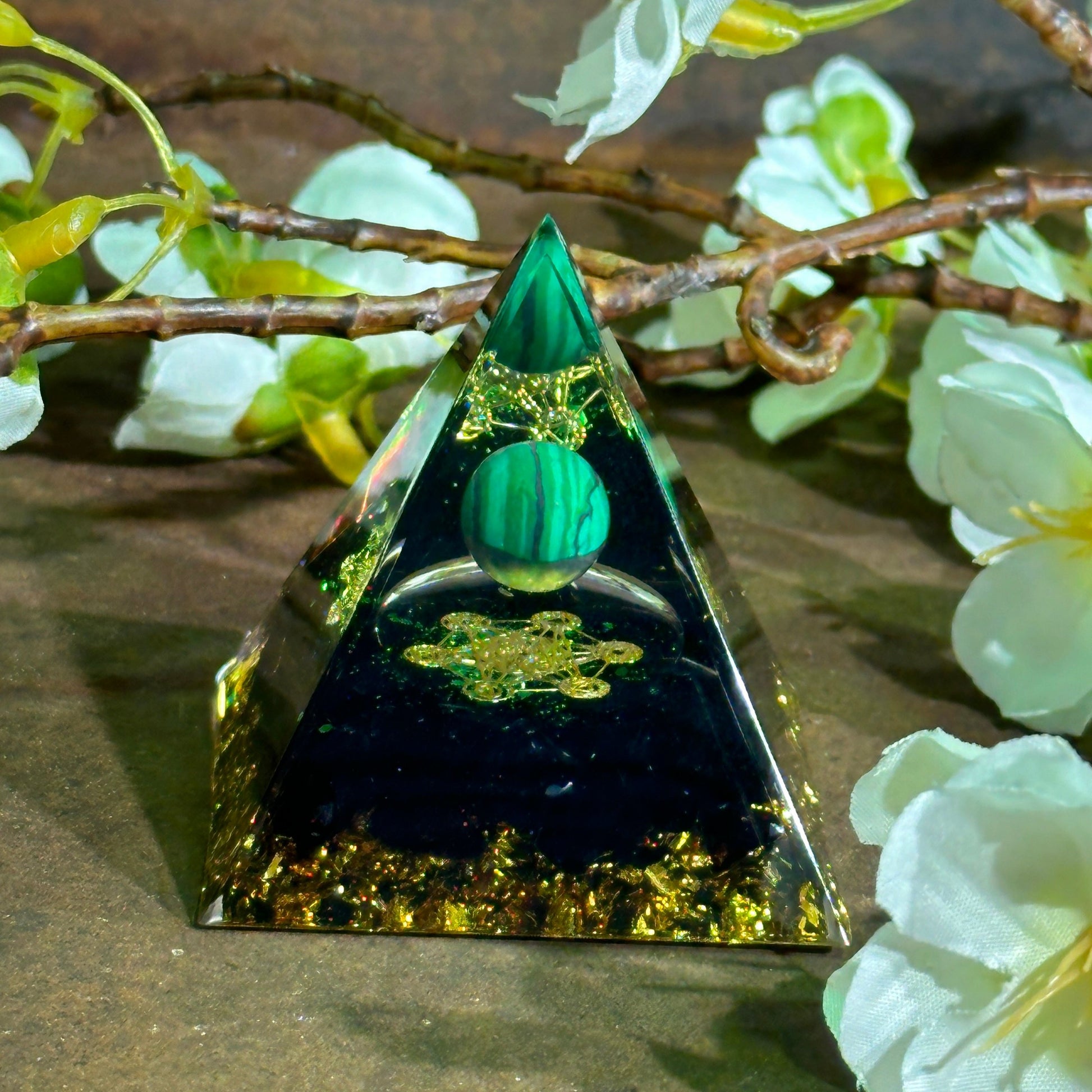 Orgonite Pyramid with Malachite & Black Obsidian | Emotional Healing, Protection & Positive Energy