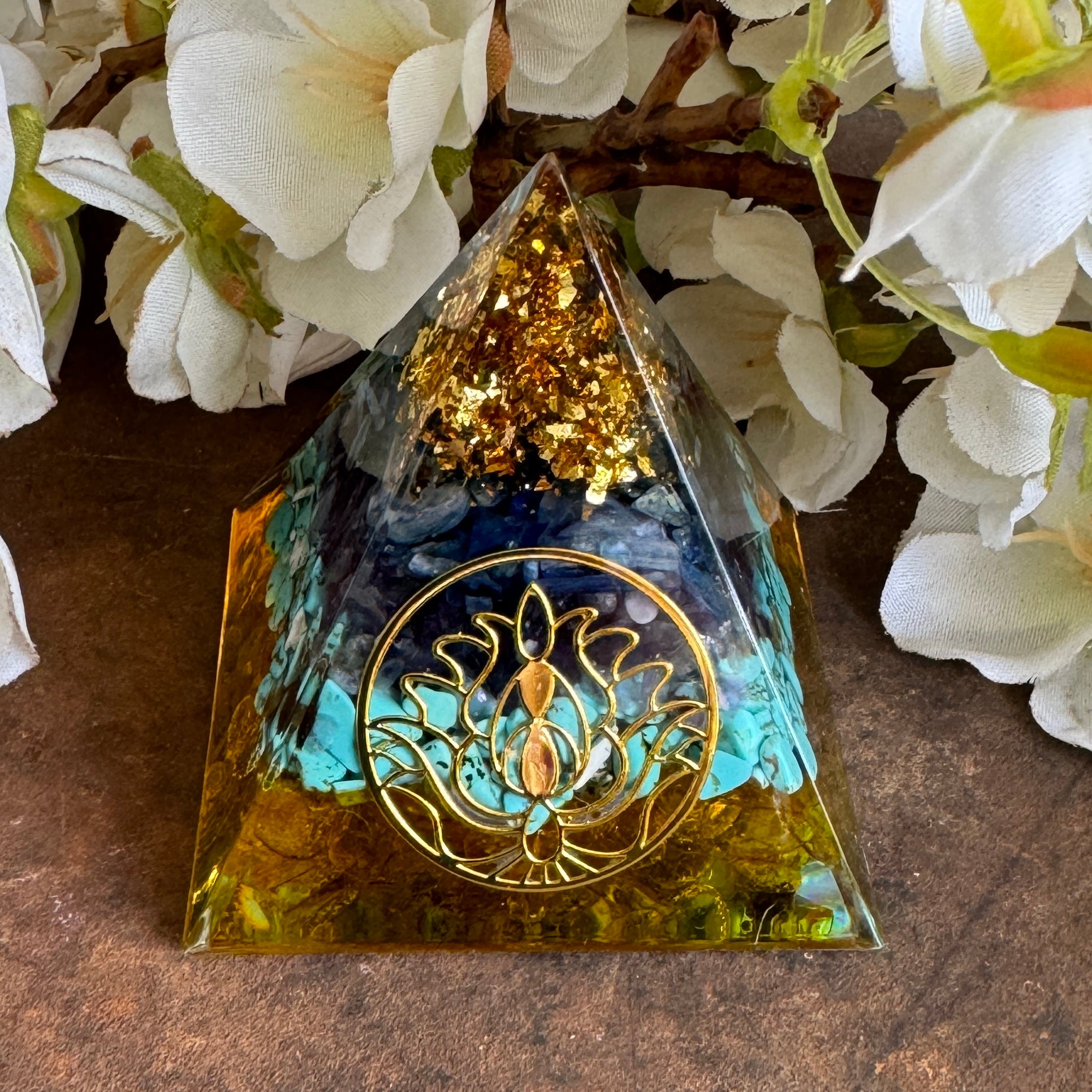 Orgonite Pyramid with Lotus Symbol – Citrine, Turquoise, Amethyst & Kyanite